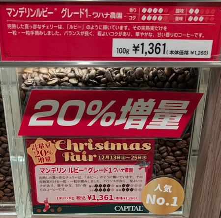 「CAPITAL COFFEE」で「20%増量」にも釣られて「マンデリンルビー グレード1」という銘柄を購入しました。