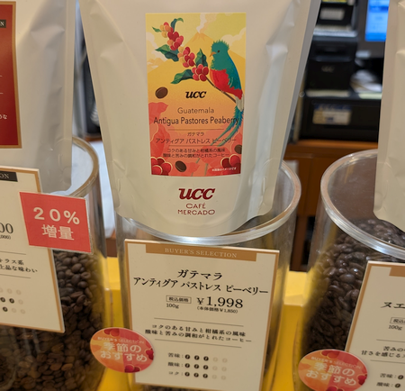 「UCCカフェメルカード」で「季節のおすすめコーヒー」の「ガテマラ アンティグア パストレス ピーベリー」を購入。