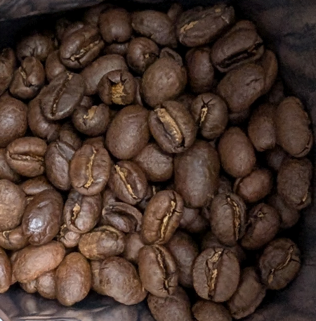 確かに丸っこい豆が多いですが、普通の平豆も混ざっています。焙煎は深めの中煎り。