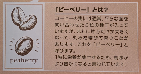 おさらいですが「ピーベリー」とは、コーヒーチェリーの中に種子(豆)が発育不良などで 1粒しか入っていないもの(通常 2粒)で通常よりも丸い形状という認識です。