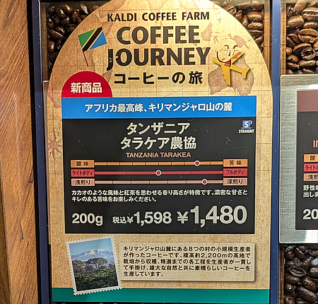 アトレ吉祥寺 B1「カルディ」で「コーヒーの旅」シリーズの新商品「タンザニア タラケア農協」を購入しました。